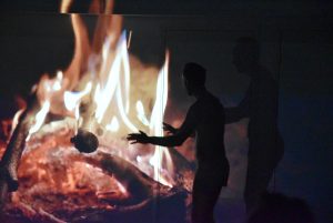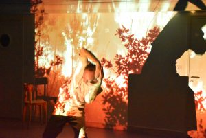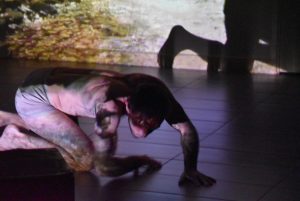 Un danseur-acrobate vit des situations corporelles évoquant les enjeux de l’écoanxiété : ombre dans les images vidéo-projetées de l’Evolution de la vie sur Terre, de l’industrialisation puis du dérèglement climatique. Animal devenant humain puis pilote de machines, il danse l’aventure de l’Humanité contrôlant la Nature.