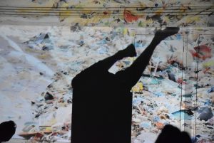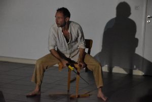 Sciant la chaise sur laquelle il est assis, il devient autruche en dansant la tête dans une boite, fait enfin monter une personne du public sur une caisse pour éviter la montée des eaux… Il parle peu mais interagit avec le public, invite à l’empathie et au jeu.